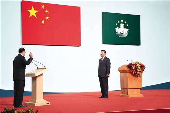 会场内,气氛庄重热烈。主席台上,中华人民共和国国旗和澳门特别行政区区旗格外醒目。当习近平和夫人彭丽媛在澳门特别行政区第五任行政长官贺一诚和夫人郑素贞陪同下步入会场时,全场起立,热烈鼓掌。 上午10时,庆祝大会暨就职典礼开始。全体起立,奏唱中华人民共和国国歌。 习近平走上主席台监誓。贺一诚首先宣誓就职,他面对中华人民共和国国旗和澳门特别行政区区旗,举起右手,依照澳门特别行政区基本法的规定庄严宣誓。宣誓完毕,习近平同贺一诚紧紧握手。 接着,由习近平监誓,澳门特别行政区第五届政府主要官员在贺一诚带领下宣誓就职。宣誓完毕,习近平同他们一一握手致意。 之后,由贺一诚监誓,澳门特别行政区行政会委员宣誓就职。 在热烈的掌声中,习近平发表了重要讲话。他首先代表中央政府和全国各族人民,向全体澳门居民表示诚挚的问候;向新就任的澳门特别行政区第五任行政长官贺一诚先生和第五届政府主要官员、行政会委员,表示热烈的祝贺;向所有关心、支持澳门发展的海内外同胞和国际友人,表示衷心的感谢。 习近平表示,澳门回归祖国20年来取得的成就举世瞩目,以宪法和澳门基本法为基础的宪制秩序牢固确立,治理体系日益完善;经济实现跨越发展,居民生活持续改善;社会保持稳定和谐,多元文化交相辉映。 习近平指出,澳门地方虽小,但在“一国两制”实践中作用独特。总结澳门“一国两制”成功实践,可以获得以下4点重要经验: 第一,始终坚定“一国两制”制度自信。澳门特别行政区政府和社会各界坚持把维护国家主权、安全、发展利益和维护澳门长期繁荣稳定统一起来,意志坚定,从不为一时之曲折而动摇,从不为外部之干扰而迷惘,善于把握国家重大发展战略和一系列政策支持带来的机遇,乘势而上,在融入国家发展大局中实现自身更好发展。澳门的成功实践告诉我们,只要对“一国两制”坚信而笃行,“一国两制”的生命力和优越性就会充分显现出来。 第二,始终准确把握“一国两制”正确方向。广大澳门同胞旗帜鲜明维护宪法和基本法确定的宪制秩序,尊重国家主体实行的社会主义制度,正确处理涉及中央和特别行政区关系的有关问题。特别行政区行政、立法、司法机关坚持把维护中央对特别行政区全面管治权和保障特别行政区高度自治权有机结合起来,坚守“一国”原则底线,自觉维护中央权力和基本法权威。澳门的成功实践告诉我们,确保“一国两制”实践不变形、不走样,才能推动“一国两制”事业行得稳、走得远。 第三,始终强化“一国两制”使命担当。广大澳门同胞以主人翁意识,把成功实行“一国两制”、“澳人治澳”、高度自治作为共同使命。特别行政区政府团结带领社会各界人士,积极探索适合澳门实际的治理方式和发展路径,集中精力发展经济,切实有效改善民生,坚定不移守护法治,循序渐进推进民主,包容共济促进和谐,让澳门焕发出蓬勃向上的生机活力。澳门的成功实践告诉我们,当家作主的澳门同胞完全能够担负起时代重任,把特别行政区管理好、建设好、发展好。 第四,始终筑牢“一国两制”社会政治基础。广大澳门同胞素有爱国传统,有强烈的国家认同感、归属感和民族自豪感,这是“一国两制”在澳门成功实践的最重要原因。特别行政区政府和社会各界坚决落实以爱国者为主体的“澳人治澳”,爱国爱澳力量日益发展壮大,爱国爱澳核心价值在澳门社会居于主导地位。澳门的成功实践告诉我们,不断巩固和发展同“一国两制”实践相适应的社会政治基础,在爱国爱澳旗帜下实现最广泛的团结,是“一国两制”始终沿着正确轨道前进的根本保障。 习近平对澳门特别行政区新一届政府提出4点希望:一是坚持与时俱进,进一步提升特别行政区治理水平。二是坚持开拓创新,进一步推动经济持续健康发展。三是坚持以人为本,进一步保障和改善民生。四是坚持包容共济,进一步促进社会和谐稳定。 习近平强调,香港、澳门回归祖国后,处理这两个特别行政区的事务完全是中国内政,用不着任何外部势力指手画脚。中国政府和中国人民维护国家主权、安全、发展利益的意志坚如磐石,我们绝不允许任何外部势力干预香港、澳门事务。 习近平指出,“一国两制”实践取得的成功举世公认,“一国两制”的制度体系也要在实践中不断加以完善。我们坚信,包括港澳同胞在内的中国人民完全有智慧、有能力把“一国两制”实践发展得更好,把“一国两制”制度体系完善得更好,把特别行政区治理得更好。中华民族伟大复兴的前进步伐势不可挡,香港、澳门与祖国内地同发展、共繁荣的道路必将越走越宽广。 贺一诚在致辞中说,作为澳门特别行政区第五任行政长官,我深感使命光荣、责任重大。我们将以“协同奋进、变革创新”作为新一届政府的施政理念,解放思想、科学决策、敢于作为,全面准确贯彻“一国两制”方针,严格按照宪法和基本法办事,切实维护国家主权、安全、发展利益,以更大的勇气和与时俱进的变革创新能力推动澳门经济社会各项事业发展,以扎实的工作成绩回报中央政府和澳门特别行政区广大居民对我们的信任和支持。相信在中央政府的支持和指导下,澳门一定会与祖国内地同发展共繁荣,共圆中华民族伟大复兴的中国梦。 丁薛祥、王晨、张又侠、王毅、马飚等出席庆