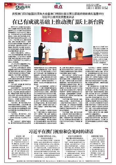 据新华社电 庆祝澳门回归祖国20周年大会暨澳门特别行政区第五届政府就职典礼20日上午在澳门东亚运动会体育馆隆重举行。中共中央总书记、国家主席、中央军委主席习近平出席并发表重要讲话。他指出