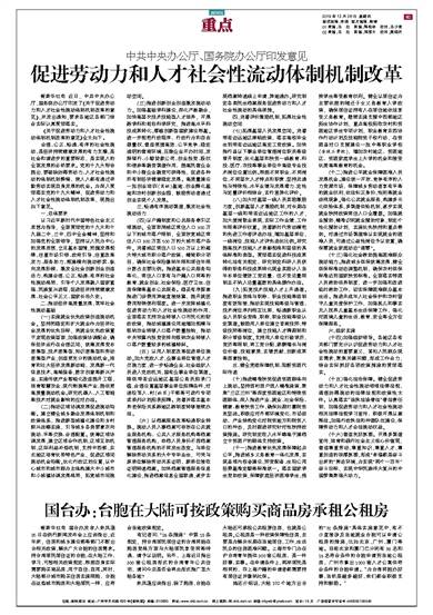 据新华社电 近日,中共中央办公厅、国务院办公厅印发了《关于促进劳动力和人才社会性流动体制机制改革的意见》,并发出通知,要求各地区各部门结合实际认真贯彻落实。