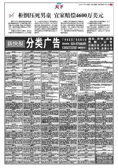 据新华社电 瑞典家具制造商宜家就问题抽屉柜压死一名美国男童之事与男童父母达成和解。男童父母代理律师6日说,宜家向男童父母赔偿4600万美元(约合3.2亿元人民币)。