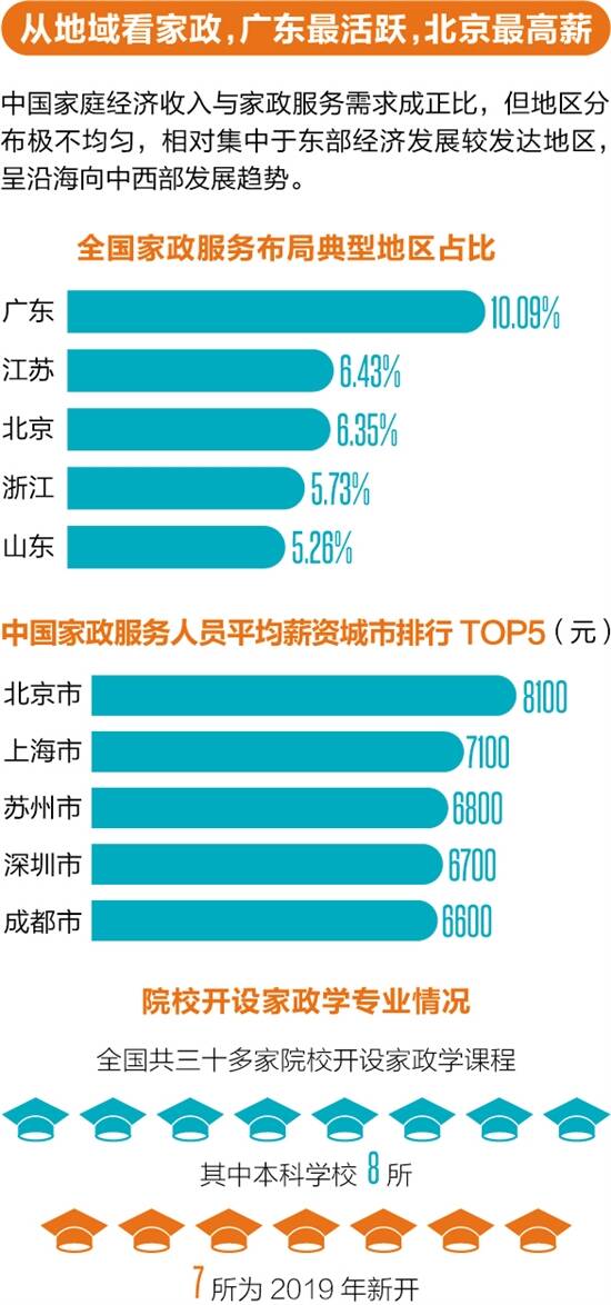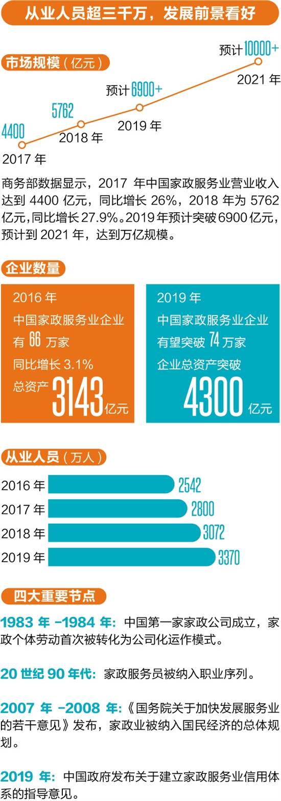 同时,家政服务受到社会广泛关注的过程中也暴露出一些行业短板和问题,包括服务人员素质良莠不齐、供求矛盾、服务市场秩序混乱等。国家政策的积极引导规范,配合互联网端的协调运用,家政服务业正逐步克服这些难题,朝着万亿级市场规模迈进。 ■策划:新快报记者 罗韵 ■统筹:新快报记者 梁彧 ■采写:新快报记者 张磊 ■制图:廖木兴 从业人员总量超3000万人 多所高校开设家政学专业 作为新兴产业,家政服务业近年来一直保持强劲的市场增长态势。据艾媒咨询数据显示,2017年中国家政服务业营业收入达到4400亿元,同比增长26%,2018年为5762亿元,同比增长27.9%。预计到2021年,可达万亿规模。另外,随着产业规模的不断扩大,相关从业机构的数量也不断攀升。据商务部测算,2016年,中国家政服务业企业有66万家,同比增长3.1%,中国家政服务业企业总资产3143亿元;2019年,中国家政服务业企业有望突破74万家,企业总资产将突破4300亿元。但从从业机构规模化程度来看,家政服务行业经营主体仍以小型企业为主,规模以下企业数量约是规模以上企业数量的2.8倍,由此可见行业规模化水平仍有较足的发展空间。 在大体量的市场环境下,催生了保洁、搬家、母婴老人护理等众多职业,一定程度上起到了促进就业和保障民生的作用。据商务部和国家发改委社会发展司公布的数据显示,2017年,中国家政服务业从业人数达到2800万人,年均复合增长率为9.7%,截至目前,我国家政服务业从业人员已经超过3000万人。值得一提的是,3000万的从业人员还远远未满足中国家政市场的刚需,我国家政服务业的需求缺口仍有1700万人,供不应求成为市场常态。对此,艾媒咨询分析师认为,随着人口老龄化和二孩政策的开放,中国的家政服务业将继续长期处于供需结构失衡状态。 具体的家政职业上,传统的简单劳务型和新兴的知识技能型将家政市场划分为两种截然不同的细分领域。简单劳务型仍然是市场主要推动力,母婴护理、养老看护和小时工三种分业态占据市场70%以上的份额。知识技能型则在高端家庭更加受欢迎,家教、理财、管家等职业成为新兴市场宠儿。在影响消费者选择家政服务因素层面,艾媒数据显示,63.6%的顾客认为家政服务人员的工作质量是影响顾客选择的重要因素,家政服务人员的家政服务经验和家政服务的收费价格紧随其后,相对不看重其他顾客的评价和家政服务人员的籍贯。 从从业人员画像分析来看,年龄结构偏大是其主要特点,30岁以上的人群占据行业从业人员80%以上,是家政市场的主力军。数据还显示,超过80%的从业人员为农村户籍,高中及以上文化水平仅占14.1%,且另外一个显著的特点是人员流动性高,大多数为行业新手。为了提高从业人员素质,改变年龄学历层次分布极不均衡的市场近况,教育部提出高等院校开设家政学专业的实施意见。目前我国共有三十多所院校开设相关课程,2019年整年,我国开设家政学专业的本科学校达到7所,家政学概论、家庭信息管理、生活哲学、现代居家设计等课程受到热捧。这也表明,家政服务业逐渐从低端市场渗透至高端家庭,服务更加精细化,从业人员的综合水平也开始向高学历高涵养方向倾斜。