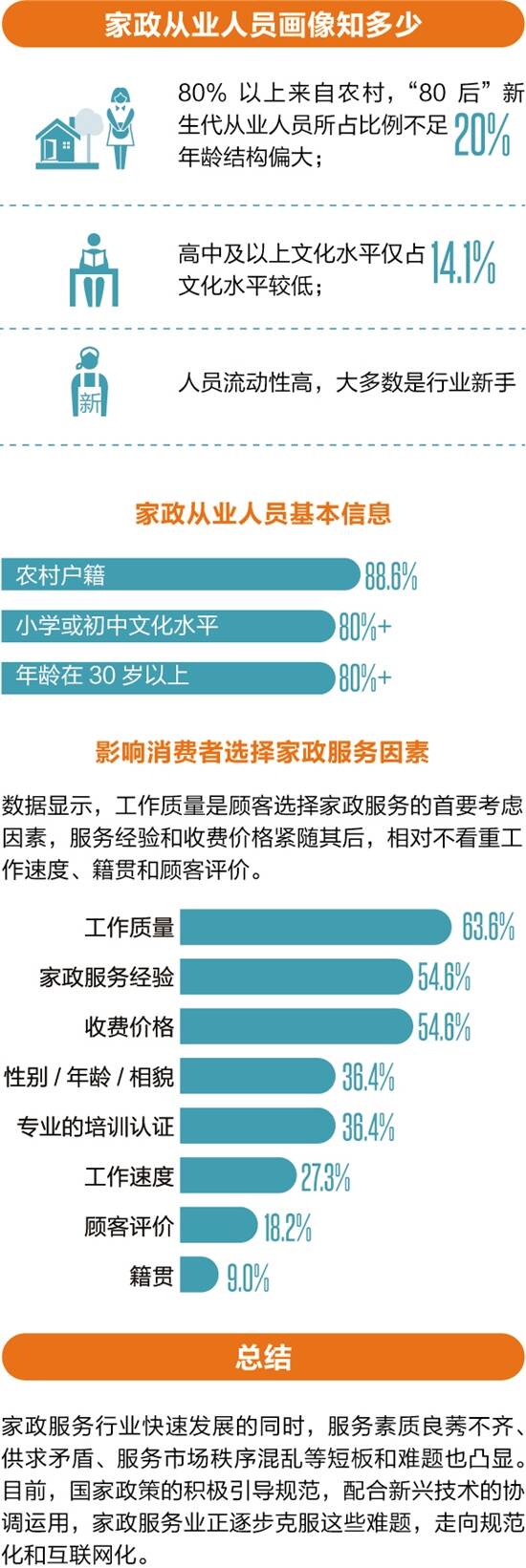 随着高新新兴技术和移动互联网的发展,员工型模式正在逐渐向平台型模式倾斜,传统的家政服务正处于向互联网转型的过程中。近年来,e家洁、云家政、阿姨帮等众多家政O2O创业公司不断涌现,BAT、58同城、美团等互联网企业也纷纷入局。通过家政服务O2O的运营模式,消费者下单之后,GPS定位和大数据技术识别对接员和匹配周边家政服务人员。另外,相关拓展服务内容也应用而生,譬如建立从业人员数据库进行考核和培训、开发家政相关产品的销售等。据了解,广州市家政服务综合平台目前已经推行持证上岗上门服务,实现家政人员“一人一码一卡一档”,雇主可通过上门服务卡实时查询基础数据,并可通过平台随时发布家政需求、预订家政服务、反馈服务质量等。预计2021年前,市妇联和市商务局将联合发放家政上门服务卡6万张以上。 由于家政服务的微利性,在全民物质水平提高的基础下,家政服务的“大众化”和“平民化”越发凸显,资本介入后“小作坊”式的服务中介结构也开始扩大经营规模。数据显示,市场上六成以上的家政企业已经改变原来的单店经营模式为连锁经营模式,服务网络逐步向全国甚至国外延伸,20%以上的家政机构平台连锁店达到50家以上,实现了跨区域连锁化发展。家政领域专家刘女士认为,预计未来我国家政服务业将从粗放式发展走向专业化、精细化和跨领域化发展,并不断涌现出更多的知名服务品牌。 值得注意的是,岁末年初一直是家政服务行业的“用工荒”时期,“小时工”“保姆”“家庭保洁”供不应求,不少机构平台也选择在此节点进行涨价,涨价的幅度大多在20%-30%左右。经常使用保洁服务的林女士表示,从去年12月开始,各大线上平台陆续涨价,涨价幅度可以接受。但是从今年1月份开始保洁服务变成了件很难的事,发出去订单之后平台少有人接单。58保洁师王阿姨透露:“加价后原本平均一天的三四单减少了一两单,顾客消费的时间也从三小时变成了两小时,我们的收入是变相减少的。”另外一位保洁师张女士表示:“年关虽然价格加了很多,但是任务量重了,更忙更累,选择回家过年更实在。” 对此,家政公司负责派单的工作人员告诉新快报记者,春节这一个月是家政人员最忙的一段时间,平台保洁师都排满了,而且回家过年的人很多,预约不到保洁服务和平台涨价是正常现象。广州人力资源市场的工作人员则表示,这种现象属于季节性缺工和结构性缺工,年尾最有代表性,招工单位和求职人数都会相对减少。 行业发展难题凸显,政府加快政策扶持引导 家政服务业的从业者准入条件不高,工资收入却很有竞争力。艾媒数据显示,在中国家政服务人员平均薪资城市排行中,北京市以8100元位居榜首,其后是上海市的7100元和苏州市的6800元。由于家政行业低门槛高薪资,因此也衍生出了从业人员素质良莠不齐、市场无序化竞争、行业诚信不足等短板和难题。这些由从业者导致的行业乱象一定程度上会影响消费者的使用体验,降低了消费者对于服务和市场的满意度。另外,服务价格混乱也让很多消费者觉得困惑。消费者赵女士表示,自己在某知名家政平台上选择“育婴师”一项,网站标明价格是15000元一个月,见面谈的时候却被告知是18000元一个月。 而在从业者层面,其自身的合法权益和也得不到切身保护,主要体现在社保购买和培训力度上面。对于市场主导型和企业主导型家政企业来说,往往面临费用、成本难以解决的问题,这也使得其在员工权益保障上缩减开支,导致无证上岗、服务标准不健全等行业乱象丛生。 市场供需矛盾则是家政行业发展的根本性难题。家庭服务中心问卷调研表明,我国家政市场的需求方和服务方存在一倍的差距,缺口将达到2000万人。面对庞大的民生需求,近年来,政府加大了对家政行业的关注,制定了规范行业发展的相关政策文件,其中有代表的一是国家发改委等17个部门于2017年出台的《家政服务提质扩容行动方案(2017年)》,二是国务院办公厅于2019年6月出台的《关于促进家政服务业提质扩容的意见》。另外,还建立了由国家发改委、商务部牵头的促进家政服务业提质扩容部际联席会议制度。 面对近年来我国家政市场的高速发展以及存在问题,商务部早前表示,近年来我国家政市场的规模在不断扩大,预计今年将继续保持20%以上的增长速度。从供给侧来看,家政服务的质量、规模、结构等方面仍有较大的提升空间。 商务部表示,接下来将主要从几个方面开展工作,一是提高供给质量,主要是提升家政服务从业人员的技能和素质;二是扩大供给规模,主要是从服务种类、服务人员数量等角度提供供给;三是优化供给结构,主要是优先发展针对一老一小等群众亟需的家政服务,四是降低供给成本,主要从降低制度性成本和提高行业效率两个方面着力;五是规范供给秩序,主要是切实保障消费者和家政服务从业人员的合法权益。 ■数据来源: 艾媒咨询《2019全球及中国家政服务行业新兴市场及发展前景分析报告》、商务部、前瞻产业研究院、《我国家政行业发展困境研究》