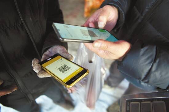 ■在拉萨市慈松塘牛羊肉临时销售点,一位牧民(左)用二维码收款。新华社发 |