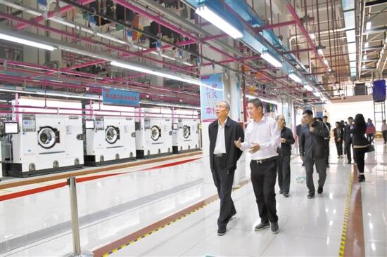 ■由金融界人士、学术界学者组成的“智囊团”深入智能化洗衣工厂车间考察企业转型升级的成果。 |