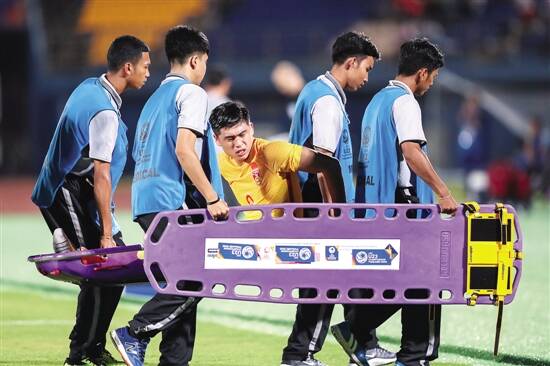 ■中国国奥队球员张玉宁受伤离场。 新华社发 |