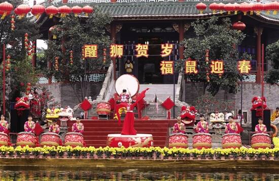 ■昨日,2020年新春岭南醒狮民俗文化活动在番禺宝墨园荔景湖水上舞台震撼上演。春节期间(年初一至初六)还将每天举行两场民俗文化表演。新快报记者 毕志毅/摄