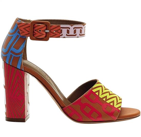 印花小牛皮凉鞋,以简约线条为灵感的图案和色彩在脚跟足尖碰撞出缤纷新意。 ▲ |