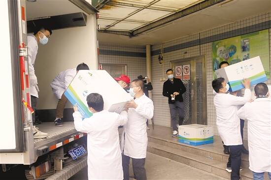 ■昨日,中山大学达安基因的一批新型冠状病毒检测试剂和配套医疗设备在广州装车发往武汉。新快报记者 毕志毅/摄 |