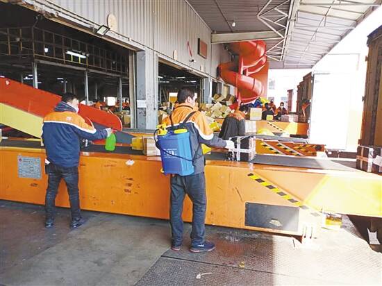 ■申通快递北京集散中心工作人员对快件进行消毒。 |
