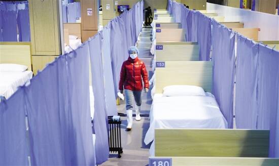 ■近日,武汉首个以中医为主的方舱医院开舱,一名工作人员在查看病区。新华社发 |