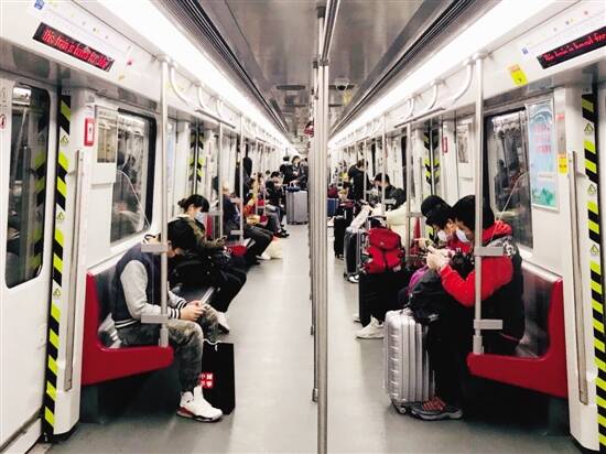 ■2月16日17时30分许,广州地铁二号线,多了不少拖着行李箱的乘客。 |