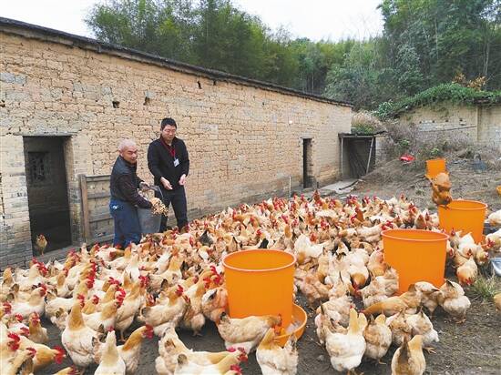 ■此前,李军威(右)与昔日贫困户罗石生一起研究防范禽流感的事宜。在此次泰东村“战疫”过程中,罗石生捐款1000元。 |