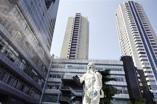 ■51岁的凤姐每天要为广东国际大厦三座大楼约130层的全部公共区域做消杀,虽然工作十分辛苦,但凤姐说,把自己的工作做好,就算是为防疫尽一份力。新快报记者 夏世焱/摄 |
