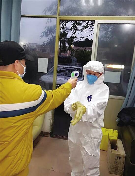 ■环卫工饶迟生在“战疫专线”出车前测量体温。 通讯员龙秀梅/摄 |