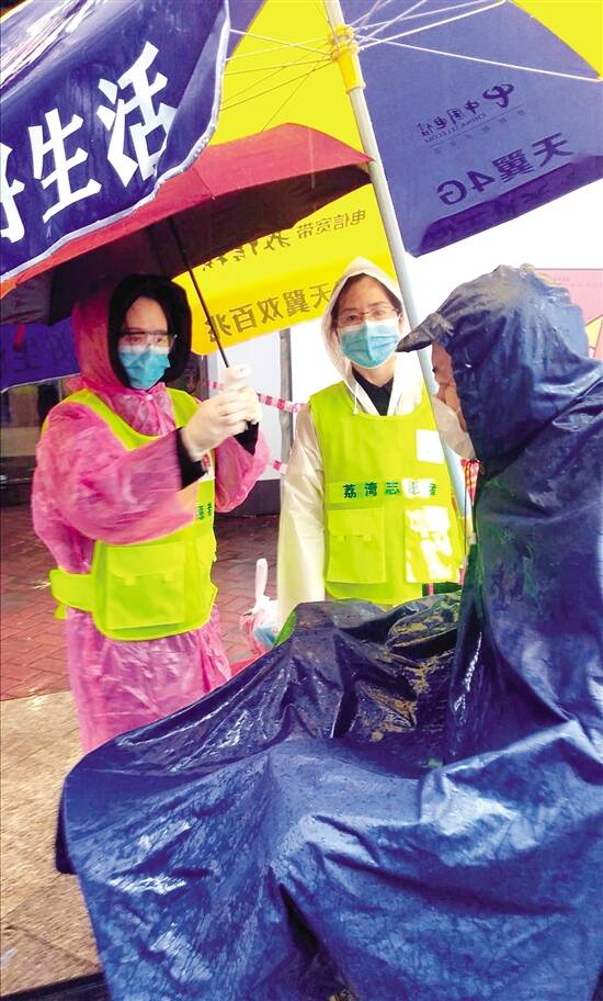 ■风雨中,荔湾区锦龙社区的在职党员在为过往街坊测量体温。 通讯员供图 |