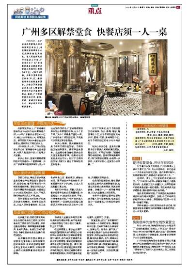 2月20日,在广东省政府新闻办召开的新闻发布会上,省疫情防控指挥部办公室疫情防控组副组长、省人民医院党委书记耿庆山介绍,广东省出台了《广东省餐饮服务业新冠肺炎防控工作指引》(简称《指引》)。《指引