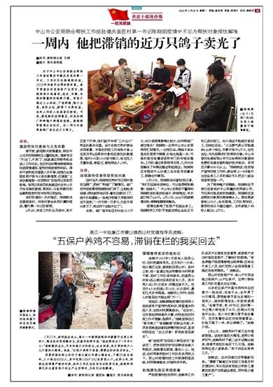 风景秀丽的西山村位于湛江廉江市横山镇东北,下辖20条自然村,人口超过6000人,其中包括109户342名贫困人口。在西山村,即使在疫情最严峻的时刻,驻村工作队也没有忘记扶贫任务,庞略和同事们关注着贫困户的生产生活情况,为他们分忧解难。 ■采写:新快报记者 潘芝珍 ■图片:受访者供图 循循善诱宣讲防疫知识 庞略于2019年5月受命入驻西山村,任村党建指导员。正月初六一大早,他从湛江出发,提前赶回西山村。返村之前,他一直通过电话和微信与村两委干部、驻村工作队保持联系,知道西山村有6名从湖北回来的返乡人员,其中两人在1月5日返乡,问题应该不大。但另外4人分别是1月18日、20日到村,最初几天并未隔离。庞略忧心忡忡,他担心村里因此可能出现“万一”。 到岗后,庞略跟随疫情防控领导小组走家串户宣传防疫知识,排查重点防控人员,劝阻村民聚集娱乐。“在农村,过年祭祖拜神是件大事,村民起初对防疫工作不理解,挺排斥。”庞略发挥自己“教书育人”“答疑解惑”的职业优势,不厌其烦地宣讲新冠病毒防控知识,直到村民回应“这么厉害?那我赶紧回家去”。 被“庞老师”劝回的人转而成为“宣讲员”,把学到的防护知识转述给家人和朋友,庞略看在眼里,喜在心上。他说,在村两委和驻村工作队的共同努力下,西山村疫情防控工作取得明显成效,村民情绪稳定,村里秩序井然。 自掏腰包购买滞销家禽 严抓疫情防控的同时,庞略和工作队成员不忘脱贫攻坚重责,逐家逐户走访村里的贫困户,了解他们的困难。“有些养殖户因疫情影响出现滞销,还有在外务工人员,他们的收入会因返程复工推迟而有所降低。” 庞略说。 西山村的贫困户中,有15户无劳动能力低保户、25户五保户,这两个群体是工作队的重点关注对象。 82岁的五保户许高与同样年迈的妻子一起生活,没有子女,去年养了58只阉鸡,原想趁春节卖出去增加一笔收入,谁知疫情发生,市场流通遇阻。“在春节前,我、村书记、驻村第一书记等人帮他卖了30只,还剩28只鸡卖不出去。老人本打算元宵节卖去餐厅,但目前餐饮业还没有恢复营业,价格又降了一半,所以滞销了。”庞略介绍。 2月21日,庞略和村干部又去许高家探视。说起栏里的大阉鸡,老两口唉声叹气,庞略和村干部二话不说掏出钱来,按春节前的价格买下几只鸡。庞略向两位老人家承诺:“我下次回去再带几只。” 庞略说,这次回湛江还带着新任务。“需要了解湛江市的招工信息及时反馈回村,早日促成有劳动力和务工意愿的贫困户实现就业脱贫,同时助力复工复产”。