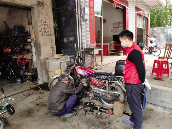 ■梁建成(右)到肇庆市怀集县永固镇永良村植成兴经营的摩托车维修店了解复工情况。 |