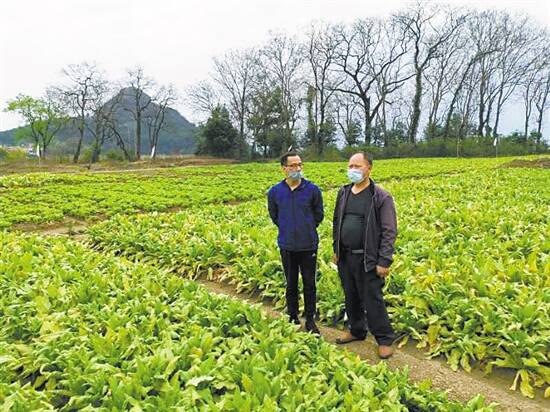 ■巾峰村驻村干部曾伟坚向洲水村民小组菜农详细了解蔬菜种植和销售情况。 |