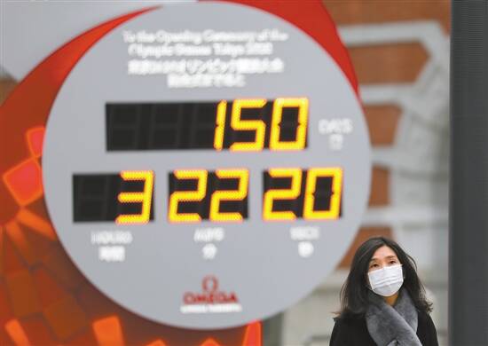 ■25日,在日本东京,行人戴口罩经过显示东京奥运会倒计时的电子屏。在疫情影响下,本届奥运会也被蒙上了一层阴影。新华社发 |