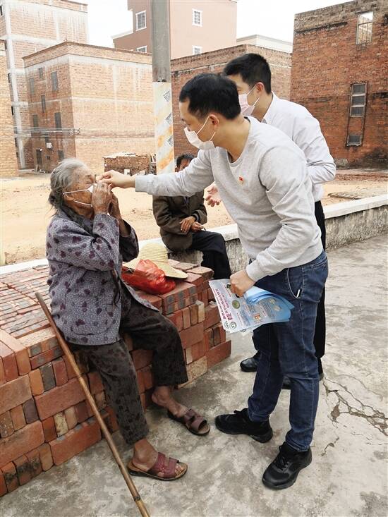 ■党员突击队给村中高龄老人派发口罩,并指导示范正确的佩戴方法。 |