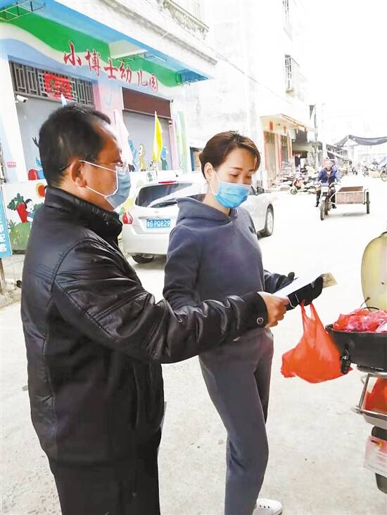 ■苏华瑜在深沟村农贸市场为村民发放新冠肺炎防控知识宣传单张。 |