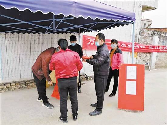 ■苏华瑜与村两委干部到深沟村委会周屋村设卡点检查督促值守人员认真做好外来人员体温测量和登记工作,张贴新冠肺炎防控告知书和发放宣传资料。 |