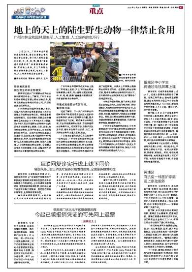 2月26日,广州市林业和园林局发布消息,指出全面禁止食用陆生野生动物。除了列入畜牧法规定的猪、牛、羊、鸡、鸭、鹅等“畜禽遗传资源目录”的家畜家禽类动物,所有地上走的、天上飞的陆生野生动物都禁止食用