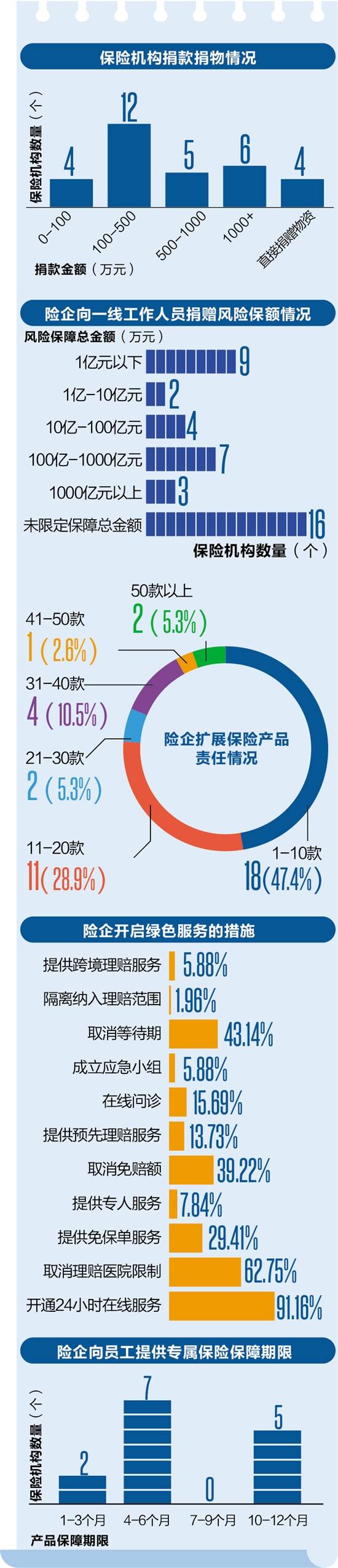 新快报记者通过企业采访、查询公开资料,并结合广东省保险协会、北京保研公益基金会等多渠道信息,统计梳理发现,目前广东省107家保险公司(包括总部在粤,以及在粤有设分支机构),已有超过79家险企开展了战疫行动,占比高达73.8%。 ■新快报记者 刘威魁 /文 廖木兴/图 31家险企直接捐赠款项和物资超过2.69亿元 随着新冠肺炎疫情的扩散,各地的医疗物资需求激增,湖北多家定点诊治医院医用防护物资库存告急。 据不完全统计,截至目前,已有31家保险机构通过直接捐款和N95口罩、防护服等紧缺物资的方式,助力疫情防控,直接捐赠款项和物资金额已超过2.69亿元。 其中,捐赠金额在100万元以下的保险机构有4家;捐赠金额在100万-500万元区间的保险机构有12家;捐赠金额在500万-1000万元区间的保险机构有5家,如中国人保的捐赠金额为1000万元;捐赠金额在1000万元以上的保险机构有6家,如中国平安的捐款金额为4000万元。 此外,直接捐赠医用口罩、消毒液等医疗物资的保险机构有4家,如横琴人寿从美国筹集40000只医疗口罩驰援武汉和宜昌。 41家险企向一线奋战人员捐赠风险保额超4.9亿元 疫情肆虐之际,来自全国各地的医疗救治队伍等一线工作人员火速集结,紧急驰援武汉。然而随着疫情扩散,参与一线抗“疫”的工作人员所面临的风险也日益凸显。新快报记者梳理发现,约有41家保险公司向医护人员、媒体记者、武警官兵、社区干部等一线人员赠送风险保障,行业占比38.3%。 据不完全统计,41家险企向一线奋战人员捐赠风险保额已超4.9亿元。其中,捐赠总保额在1亿元以下的保险机构有9家,如天安人寿已为24位奋战在抗疫一线的媒体记者累计提供了2400万元的保险保障;捐赠总保额在1亿-10亿元区间的保险机构有2家,如紫金保险向343名江苏医疗队及江苏赴汉报道记者,提供60万元保额/人,累计总保额达2.058亿元;捐赠总保额在1000亿元以上的保险机构有3家,如中邮保险向24.42万一线抗疫的医护人员、新闻工作者、邮寄寄递员工提供保障额度为50万元/人的风险保障;未限定捐赠总保额上限的保险机构有16家,如工银安盛人寿方面表示,将为湖北疫情防控医护人员提供免费人身保险,每人保险金额100万元,如有感染新冠肺炎的,住院治疗期间每人每天获得300元补助金。 38家险企超589款保险产品责任扩展至新冠肺炎 为了更大发挥出商业保险在疫情中的作用,越来越多的险企响应银保监会的号召,将旗下部分保险产品的保险责任扩展至新冠肺炎,为因感染新冠肺炎客户及家属提供多重贴心保障。 据不完全统计,截至目前,已有38家保险机构超589款保险产品将保险产品责任扩展至此次新冠肺炎,行业占比35.5%,新快报记者查阅各家险企的产品清单发现,这589款产品大多囊括重疾险、意外险、疾病险、医疗险、寿险等多种产品类型,其中,重疾险所占比重最高。 具体来看,扩展保险产品数在10款以内的保险机构最多,有18家。如泰康人寿将6款重疾险产品责任扩展至新冠肺炎。扩展保险产品数在11-20款之间的保险机构有11家,如阳光保险将12款重疾险产品责任扩展至新冠肺炎。扩展保险产品数在31-40款之间的保险机构有4家,如中国人寿将33款重疾险产品责任扩展至新冠肺炎。值得一提的是,汇丰人寿将旗下所有保险都纳入此次责任扩展范围。 51家险企开启绿色理赔通道、简化理赔流程 在提供保障的基础上,监管部门还支持保险机构放宽保险条款限制,便利新冠肺炎的患者;同时也适当降低理赔标准、简化理赔流程,大幅提升了保险理赔效率,将支持防疫工作放在首位。 新快报记者留意到,截至目前,已有中国人寿、中国人保、中国平安、中国太平、中意人寿、泰康保险、中信保诚人寿等51家保险机构明确提出,将在疫情期间提供专属绿色理赔服务,行业占比47.7%。其中,92.16%的保险机构都提供了24小时在线理赔服务,如中国太平提供7×24线上理赔问诊答疑及专属跨境客户服务;62.75%的保险机构取消了理赔医院限制,如中意人寿对因感染新冠肺炎的出险客户取消自费药品限制、取消诊疗项目限制、取消定点医院限制、取消免赔额、取消医疗险30天观察期;29.41%的保险机构提供了免保单服务,如针对感染新冠肺炎的客户,新华保险无需客户提供保单即可申请理赔,并由理赔服务人员主动协助核实验证客户身份。 据不完全统计,目前已有中国人寿、泰康保险、太平人寿、中意人寿等近20家险企为旗下保险用户启动新冠肺炎专属赔付。比如,1月25日至2月19日期间,中国人寿为23.62万客户提供了保险理赔服务,涉及新冠肺炎的相关理赔案件62件,赔付保险金685.08万元。 14家险企相继推出员工关怀举措 为进一步应对新型冠状病毒肺炎疫情,多家保险公司也相继推出员工关怀举措,为一线营销员提供针对疫情的保险保障产品。新快报记者梳理发现,目前已有新华保险、华夏人寿、泰康保险、友邦保险等14家保险公司针对公司的内、外勤人员推出特殊时期专项福利保障保险方案,行业占比13.1%。 其中,大部分保险机构为员工提供的疫情保险保障产品的保障期限为3-6个月,如人保寿险为公司全体销售人员提供“新冠肺炎关爱保障计划”,最高累计赔付40万元,有效期为2020年2月1日至2020年6月30日;为员工提供的产品保障期限为一年的保险机构有4家,比如,泰康人寿向销售人员推出“新型冠状病毒肺炎”爱心专属保障方案,最高可赔付50