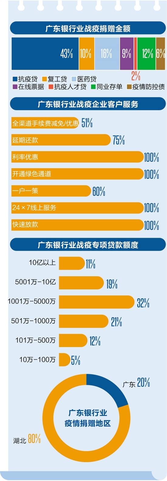 如果说金融服务是广东银行业“抗疫战”胜利的保障,那么创新金融产品就是打赢这场金融抗疫战的最有力武器。据新快报记者不完全统计,针对疫情防控、中小企业复工等企业的资金需求,20家广东银行机构中共有15家推出了专项贷款产品,占比高达75%。其中,贷款额度3000万元以上的超过五成。 在助力防疫企业生产的金融战“疫”中,广东银行机构纷纷对疫情生产企业推出专属类融资产品,如中国银行联合省工信厅、省人才办分别推出了“战疫贷”和“战疫人才贷”,农行广东省分行针对防疫企业量身定做的“胜疫贷”、建行广东省分行的“战疫贷”等等。 与此同时,为了中小企业战“疫”得到更充分的资金保障,银行机构也推出了多项助力小微企业复工复产的专项贷款,如工商银行广东省分行推出“复工贷”系列产品、建行广东省分行推出的“云义贷”产品等。 为满足定向用于支持疫情防控有关企业的贷款投放等资金需求,银行业还“祭”出了支持疫情防控的又一“神器”——防疫同业存单。截至2月26日,上述20家银行共有16家银行在全国银行间市场发行了防疫专项存单,发行规模总计达到255.4亿元,成本低于同期市场平均水平。其中,民生银行发行规模最大,达37.9亿元,招商银行、工商银行的发行规模分别为30亿元和27亿元。城商行中,广州银行也于2月26日发行了3亿元的防疫专用同业存单。 此外,广东银行机构还通过承销战疫专题债券、在线票据贴现等业务支持企业抗击疫情。如就在上周,为了定向支持疫情防控领域企业复工复产,广发银行在上海、沈阳、武汉落地三笔疫情防控债,累计承销金额超过21.25亿元,并在发行价格、利率等方面创下业务纪录。 在产品创新上,为了提高效率近三成银行信贷产品采用了纯信用的线上贷款,其中有17%的信用贷款产品、9%的线上票据贴现产品,实现了几个小时内完成线上放款。 保障健康,回笼现金营业网点均要多次消毒 2月3日开始,广东省内各银行机构安排营业网点轮值对外营业。为尽可能减少人员聚集,阻断疫情传播途径,银行业金融机构采取了多项措施保障员工和客户的健康。据媒体报道披露,目前广东各家银行营业网点每天均进行三次全面消毒,并在营业网点还配备枪式体温测量仪、洗手液、消毒剂、口罩等防护物资,营造安全、放心、可靠的金融服务环境。 此外,为了让广大人民群众用上“放心钱”“卫生钱”,同时给一线柜员提供安全健康的作业环境,广东各大银行机构在疫情防控期间保障现金供应和开展现金消毒工作。对收入现金进行消毒杀菌后,对外给付新钞或经过消毒杀菌的符合要求的专用钞,同时严格按照要求,医院、农贸市场、公交企业回笼的现金经过严格的消毒杀菌处理后上缴人民银行广州分行,不再进入流通环节。
