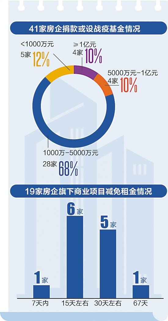 在抗击新冠肺炎疫情中,广东各大房地产企业积极主动捐款、捐赠物资、减免相关物业租金等,积极投入到疫区支持工作中,履行社会责任。一些头部房企如碧桂园、中国恒大等捐款金额达2亿元。部分房企利用各种渠道全球采购抗疫一线所需的口罩、防护服、护目镜等,并克服重重困难送至武汉乃至湖北疫区。 直接捐款或建战疫基金 4家房企捐赠超1亿元 据对44家总部在广东或已在广东布局的房地产相关企业的不完全统计,其中41家企业通过直接捐款或设立战疫基金的方式支援疫情防控工作,累计捐款13.27亿元。这些捐赠金额主要用于采购口罩、防护服、护目镜、消毒液等战疫紧缺物资,以及用于对疫情防控区一线医护人员和患者提供帮助。 在直接捐款或设立抗疫基金的41家企业中,4家房企捐赠超1亿元,占比10%;4家房企捐赠在5000万—1亿元之间,占比10%;28家房企捐赠额在1000万—5000万元之间,占比68%;5家房企捐赠额在1000万元以下,占比12%。 其中,头部房企碧桂园、恒大、融创、万科4家企业捐赠金额超1亿元,碧桂园、恒大均为2亿元。碧桂园集团在捐赠1亿元设立首期新冠肺炎疫情基金的基础上,又通过国强公益基金会追加捐赠1亿元;恒大集团向武汉市新冠肺炎防控指挥部捐赠2亿元,原则上由武汉市新冠肺炎防控指挥部统一调配使用;融创先后向武汉市红十字会、武汉市慈善总会捐助1.1亿元;万科公益基金会向武汉红十字会捐赠1亿元,原则上由武汉市新冠肺炎防控指挥部统一调配使用。 捐赠建筑材料、煲仔饭机器人等特色物资 在纳入统计的44家房企中,有22家企业通过捐赠物资方式支援抗疫,其中20家企业(占比90.9%)捐赠口罩、防护服、护目镜等一线急需医疗物资,另有一些房企利用自身特有资源捐赠一些前方急需的特色物资。 2家房企捐赠了高端远程超声诊断系统或心电监护仪、呼吸机等高端医疗设备。如碧桂园向湖北捐赠的远程超声诊断系统,允许医生远程控制机械臂和超声机器对病人进行实时操作和扫查;根据广东援助荆州医疗队的需求,2月16日,敏捷集团捐赠的20台无创呼吸机陆续抵达荆州市第一人民医院、洪湖市人民医院等4家医院。另外,碧桂园捐赠的煲仔饭机器人高温烹饪的菜品出餐只需要15秒,让武汉抗疫前线医护人员24小时吃上了热乎饭菜。 4家企业向湖北捐赠蔬菜。碧桂园在全国8省16县采购首批扶贫农产品240吨驰援湖北;深圳佳兆业足球俱乐部从菜农手中采购了250吨蔬菜送往湖北;恒大人寿向武汉市捐赠5000吨蔬菜,助力武汉保障市民吃上新鲜蔬菜;中国铁建也向湖北捐赠了蔬菜。 3家企业捐赠建设或改造医院所需物资。保利发展捐建3600万元物资援建武汉“方舱医院”;美的置业捐赠总价值逾300万元美的空调,用于抗击疫情医院改造工程;中国铁建捐赠彩钢板房、工地围挡、集装箱等。 不同程度减免旗下商业项目6—67天租金 受疫情影响消费领域受到冲击,包括万科、万达、龙湖等房地产企业宣布不同程度减免租金的措施,助力抗击疫情,共渡难关。在统计的44家企业中,据初步统计19家企业(占比43.18%)旗下商业项目实行减免或减半租金。 19家企业中,11家企业实行租金减免政策,占比57.9%,8家企业实行租金减半或适度减少政策,占比42.1%。 纵观不同程度减免租金的19家企业,除三家未明确减免时间外,最长的可减免67天租金,最少6天。减免时间在一周内的为1家,占比5.3%;减免时间在半个月左右的有6家,占比31.58%;减免时间为一个月左右的有5家,占比26.32%;减免租金时间最长的为龙湖集团67天,对旗下商场的所有商户,2020年1月25日(农历大年初一)至2020年3月31日期间,租金费用(含物管费、推广费)减半。 跨界战疫 派出医护或员工支援湖北医院 在此次战疫中值得一提的是,部分跨界医疗行业的房企,利用自身业务优势,展现了与众不同的救援优势。旗下拥有医院的房企,如碧桂园、绿城中国直接将精锐医生派往疫区支援。在44家企业中,有4家企业(占比9.1%)利用特有资源派出医护人员或员工奔赴湖北。 碧桂园核心联盟企业安和泰医院首批3名医护人员,随广州呼吸健康研究院—碧桂园·安和泰湖北蕲春县医疗支援组奔赴湖北;浙江绿城心血管病医院驰援武汉医疗队誓师出征湖北,这是中国非公医疗机构协会派往武汉的第二支浙江非公医疗队;中国铁建所属中铁十二局中心医院、中铁十七局中心医院,相继派出医护人员增援湖北;金科首批派出由网格管家、公共维修岗、安全班长、设备专家、运维专家等组成的13名业务素质高、应急经验丰富的员工驰援武汉火神山医院,主要负责火神山医院非隔离区的消杀工作、卫生保洁以及秩序维护。 除派出医疗人员支援一线外,有3家企业(占比6.8%)利用自身医疗资源抗疫。华润医疗旗下110多家医疗机构加入抗击疫情,并推出了以视频咨询为主的“华润医疗在线咨询平台”;佳兆业旗下双林生物通过广东省红十字会向广东省10家新冠肺炎定点收治医院捐赠了3900支战疫药品——静注人免疫球蛋白(PH4),以用于患者的救治及医护人员的防护;绿地康养发挥医疗资源整合能力,为一线抗疫调配紧缺药品和物资。 利用自身优势 援建防疫重点工程 为集中收治新冠肺炎患者,武汉市需要火速新建火神山和雷神山两座医院,后续又陆续建起“方舱医院”。在此过程中,一些房企利用自身建筑优势,驰援医院建设。在统计的44家企业中,4家企业(占比9.