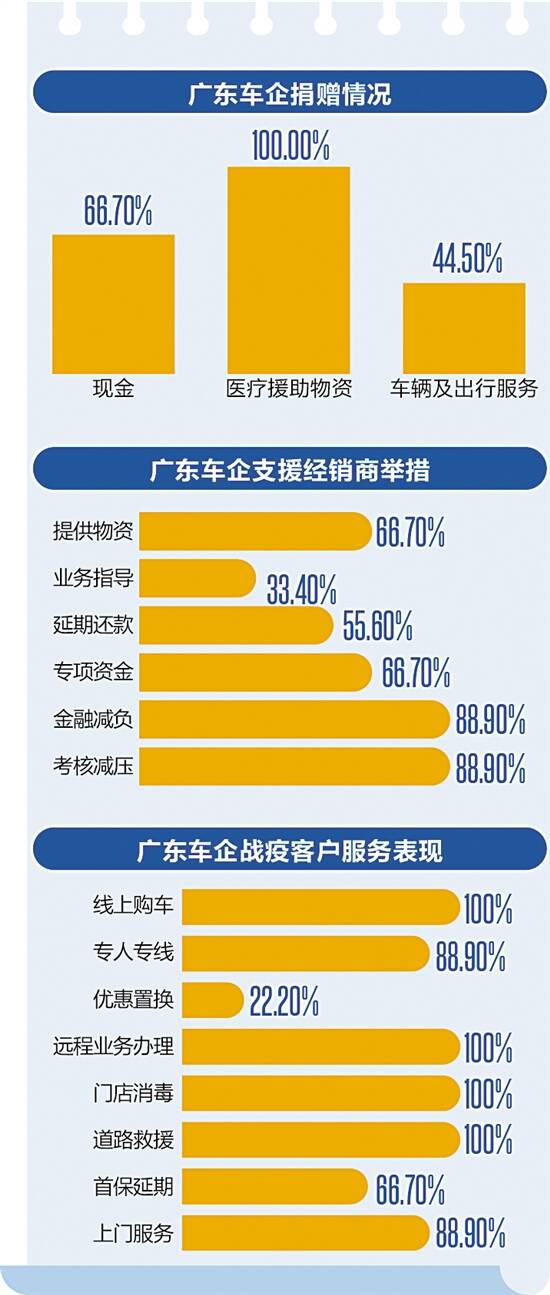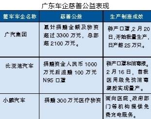 廖木兴/图 新冠肺炎疫情之下,整车制造企业受到巨大冲击,不少车企启动紧急防疫控疫措施,同时也以资金和车队等多种形式驰援一线,践行社会责任。日前,新快报记者通过企业采访、查询公开资料等渠道收集信息。据不完全统计发现,目前,在粤5家合资品牌、4家本土自主品牌共9家车企参与了这场疫情防控大战。广汽集团和比亚迪两家整车制造企业发挥出生产制造优势,转产口罩和消毒液等紧缺物资。 累计捐赠 超4700万元 疫情发生以来,以广汽集团下属品牌、比亚迪、小鹏汽车为代表的广东车企进行了多次捐赠。截至目前,9家车企捐赠资金和物资超过4700万元,其中广汽集团总部和比亚迪汽车超过千万元,捐赠500万元以上的品牌2家,占比22.2%,捐赠500万元以下的有7家,占比77.8%。 具体来看,广汽集团携旗下单位多次捐赠,累计捐赠金额及物资已超3300万元,其中广汽集团总部超2100万元,除了前两批捐赠1400万元现金及物资之外,后继续追赠手术衣、N95口罩等紧缺物资和车辆。比亚迪方面,1月28日,通过比亚迪慈善基金会向湖北省慈善总会捐赠1000万元,之后又采购价值100万元的疫情防控物资N95口罩。作为造车新势力的小鹏汽车,也积极启动援助行动,捐赠300万元物资。 从9家品牌捐赠情况具体来看,物资主要以防护服、护目镜和口罩为主,资金的去向则是主要用于采购防疫物资,支持重点省份开展疫情防控工作,帮扶在疫情防控一线的医护人员,以及用于疫区特殊人群的防治保障和家庭资助。 值得一提的是,除了捐钱捐物,其中广汽传祺、广汽菲克、广汽三菱、小鹏汽车四家车企也通过捐赠车辆和免费提供出行服务的方式来支持疫情防控。其中,广汽传祺累计捐赠800万元防控用车,并为防疫相关单位提供55台车辆免费使用。 跨界战疫 “光速”量产口罩解燃眉之急 在这场疫情防控大战中,医疗物资成为冲锋主力军。为了解决各地“一罩难求”的现象,广汽集团和比亚迪汽车两家也发挥其生产制造优势,联合供应商转产口罩、消毒液等重要物资,及时为抗疫续力。 两家均实现了“光速”量产,在一个月内将生产的口罩和消毒制品发往疫情和急需单位。记者从广汽集团方面了解到,其首台口罩生产设备安装调试到批量生产只用了不到10天。2月20日,广汽集团正式开始自制口罩的批量生产,首批共5条生产线同时开启,日产能达到25万只。当天,广汽集团向广州市慈善会捐赠了100万只首批自制口罩。 广汽生产出来的口罩由广州市政府统筹,优先支援医疗、公交、出租车、地铁等防控疫情和公共服务的一线人员使用。 比亚迪汽车方面,宣布援产口罩和消毒液到首批医用级免洗消毒凝胶实现量产发货给一线抗疫人员也只用了8天。2月20日,比亚迪免洗洗手液消毒凝胶获得卫生许可证,并官宣将原计划日产10万瓶的产能扩大至30万瓶。另外,新快报记者2月21日从工商网站获悉,汕尾比亚迪电子有限公司2月21日变更经营范围,新增“口罩生产设备的研发、生产及销售”的业务。 调整销量考核目标 推经销商减负政策 受到疫情的影响,汽车销售终端受到巨大冲击,数据显示,2月上旬中国汽车市场销量下滑超九成。对此,8家车企纷纷调整经销商政策,占比88.9%。其中,考核减压、金融减负、专款帮扶三方面是8家车企支援经销商的主要手段。 广汽方面透露,广汽菲克提出取消2月批售目标考核、额外追加30天库存融资支持等六项支援举措;广汽传祺设置1100万战“疫”基金;广汽新能源给予经销商业务指导,在疫情期间指导线上营销的对应策略。比亚迪方面,相关经销商减负政策包括取消或优化2月销售考核、为经销商提供一定整体运输物流资源补贴、提供金融相关政策支持等。 下转T09