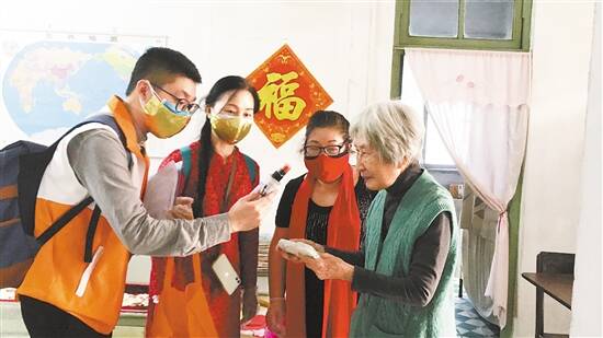 ■越秀区人民街的社工和志愿者上门给老人送口罩和洗手液。 新快报记者 邓毅富/摄 |