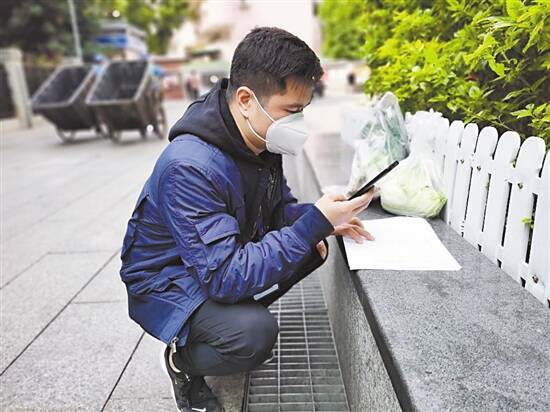 ■在天河区石牌街绿荷社区,居委会主任池伟东为居家观察人员送菜。 新快报记者 朱清海/摄 |