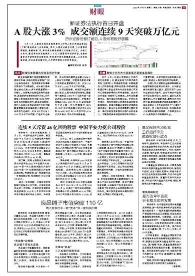 3月1日,A股再次迎来里程碑事件,《中华人民共和国证券法》(下称“新证券法”)正式实施。昨日,A股走出独立行情,三大股指表现强势,涨幅均超3%,两市成交额连续第九天突破万亿元。分析人士表示,新证券