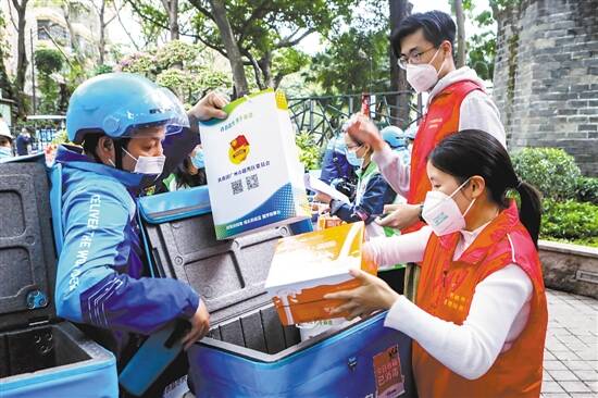 ■越秀区关爱战“疫”一线医护家庭爱心礼包配送日,8名骑手从志愿者手中接过一袋袋爱心礼包,第一时间送到防疫一线医护人员家中。新快报记者 夏世焱/摄 |