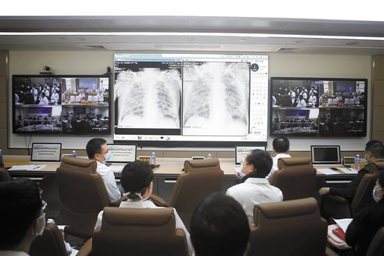 ■昨日下午,20多名顶尖专家齐聚中山一院高端远程会诊中心,为广东省内5名新冠肺炎危重症患者“把脉问诊”,讨论和制定最佳治疗方案。 |