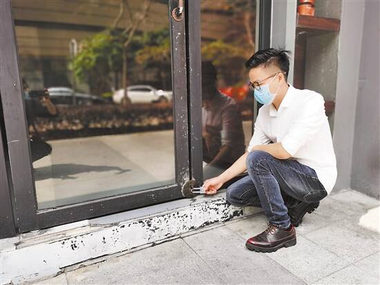 ■在海珠区琶洲蟠龙新街,李先生开的店被房东锁门。 新快报记者 朱清海/摄 |