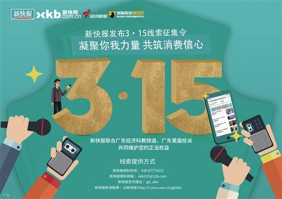 毫无疑问,即便在非常时期下,消费维权依旧重要,企业、商家依旧要做到严守信用、严控品质,以保障消费者的安全权、知情权、监督权、公平交易权。新快报作为党的新闻媒体,一直坚持为维护消费者的合法权益发声,自2012年推出“新快315”栏目以来,凭借传统媒体的影响力、公信力,以及多平台、多形式的传播优势,充分发挥媒体监督和舆论引导作用,已为众多消费者解决了生活、工作中遇到的各种消费投诉。 2020年,全国消协组织消费维权年主题为“凝聚你我力量”,旨在凝聚社会各界共识,形成消费维权领域人人有责、人人尽责、人人享有的新局面。在今年“3·15”国际消费者权益日即将来临之际,新快报一如既往向广大消费者发布征集令,多渠道征集消费者的维权线索、行业内幕、维权故事。我们将继续与广东经济科教频道、黑猫投诉广东站合作,并联合相关职能部门,形成维权合力,共筑消费信心。 不管您是在住房、金融、口腔、美容、汽车、家装、家电、食品、旅游等传统消费过程中不幸遭遇了权益侵害,或是在某些新型消费领域、消费方式上吃了亏上了当,或者是您了解某些行业中不为人知的消费陷阱、黑幕,还是在疫情期间遭遇不规范经营行为,欢迎您马上联系新快报,我们将第一时间与您联系,派出记者深入调查暗访。对于无视消费者合理合法诉求的企业,我们也将进行曝光,并在知名律师及消费领域学者的帮助下,为维护您的正当权益而倾尽全力。 如果您有好料、猛料,那就赶快行动!新快报承诺,将对所有报料人的资料进行严格保密,绝不外泄任何个人信息。重要报料线索一经采用见报,将给予重奖。 线索提供方式 ●新快报报料热线 :020-87776333 ●新快报报料邮箱 :xkb315@126.com ●新快报官方微信 :gd_xkb ●新快报新浪微博 :@新快报 http://t.sina.com.cn/gdxkb
