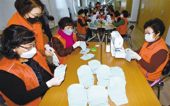 ■3月5日,在韩国光州,志愿者们为低收入家庭制作口罩。新华社发 |