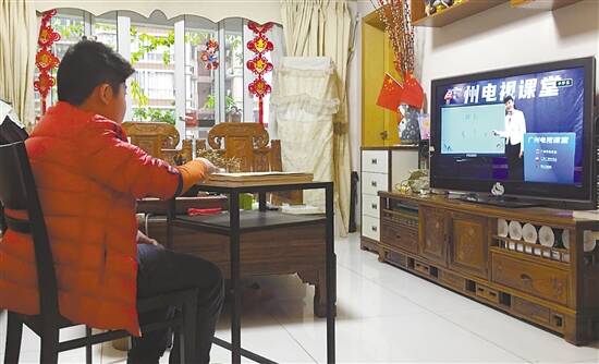 ■广州市天河区华景小学的学生在家通过电视直播学习。新快报记者 宁彪/摄 |