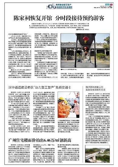 ■新快报记者 李佳文 83岁老婆婆游陈家祠“庆生” 3月10日上午9时,陈家祠的工作人员严阵以待,做好准备迎接游客进馆。 五分钟后,家住海珠区珠江泳场的陈达开带着83岁的母亲黄婆婆来到陈家祠,经过安检、体温监测后,走进了陈家祠的大门。他们是陈家祠受新冠肺炎疫情影响于1月24日闭馆后接待的第一批游客。 “3月9日是我妈妈83岁的生日。因疫情的影响,她一直都在家里待着。我今天带妈妈出来散散心,路上晒到久违的清晨大阳,一路十分高兴。”陈达开兴奋地告诉记者,他一直都关注着陈家祠的公众号,3月9日看到该馆恢复开馆的公告后,便第一时间在网上预约了第二天进馆参观的门票。3月10日一早,他们就坐车过来。参观过程中,黄婆婆显得很是开心。 截至10日上午10时,共有6名预约了门票的游客进入陈家祠参观。 当天下午,新快报记者在陈家祠碰到陕西游客刘女士。“我知道陈家祠出名,所以趁着出差有空,特意过来看的,没想到是第一天恢复开放,感觉自己很幸运呢!”刘女士透露,自己平时也很喜欢旅游,不过因为疫情的原因在家呆了一个多月,这次能出来走走感觉很放松。“陈家祠的防控措施也做得挺好,门口有专门的工作人员测体温,进来里面人也不多,而且景区提供了消毒洗手液,进来游玩感觉很放心。” 陈家祠何以率先恢复开馆 “按照复工复产的相关指引,有敞开空间开放的博物馆可以率先恢复开馆,而陈家祠刚好符合这些规定,所以我们馆就有限度地开放了。”陈家祠有关负责人告诉记者。 目前陈家祠只开放露天场所和敞开式展厅,封闭式展厅、服务场所均暂不开放;暂不接待团体观众;暂不提供人工讲解服务;开放时间为09∶00-17∶30,游客进馆时间为09∶00-17∶00。该馆每日的观众接待量为480人次,每小时可预约60人次,观众可通过微信“广东民间工艺博物馆服务号”预订门票。 对比以往陈家祠每天1.5万人次的预约量,目前480人次的接待量较少。何时才会增加接待的观众人数?该负责人表示,如果疫情控制情况越来越好,陈家祠将考虑慢慢增加接待的观众数量,直至达到平时正常的接待状态。