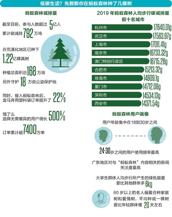 同时,低碳经济迎来更多发展机遇和可能。基于互联网平台的绿色租赁、绿色消费、绿色办公、旧物回收等行业和低碳行为不断增加且继续呈上升趋势。 ■策划:新快报记者 罗韵 ■统筹:新快报记者 梁彧 ■采写:新快报记者 张磊 ■制图:廖木兴 互联网绿色公益减排 18到30岁的年轻人最关注“蚂蚁森林” 作为现象级互联网绿色公益项目,蚂蚁森林的出现为绿色金融实践提供了样本。数据统计显示,于2016年8月正式上线的蚂蚁森林,目前已带动超过5亿人参与,累计碳减排792万吨,换算成的“绿色能量”在荒漠化地区已种下1.22亿棵真树,种植总面积近168万亩,同时守护着18万亩公益保护地。另外,在接入蚂蚁森林后,盒马弃用塑料袋订单提升了22%,饿了么选择无需餐具的用户增长500%,订单累计超7400万单。 从蚂蚁森林的用户群体分析来看,大学生是蚂蚁森林的忠实用户和主力军,其中,步行、线下支付、乘坐公共交通、使用共享单车、不用一次性餐具、无纸化阅读等是该群体最常见的低碳生活场景。另外,数据显示,大学生群体人均步行所产生的单项绿色能量要比其他群体多6kg。从年龄分布上来看,今日头条阅读数据的反馈显示,关注“蚂蚁森林”的用户年龄集中在18到30岁之间,其中24-30岁之间的用户关注最高。从关注区域分布来看,广东地区对与“蚂蚁森林”内容相关的新闻关注度最高,其次为江苏、山东、河南、浙江、湖北、北京、河北、四川、上海等地的用户。 作为蚂蚁金服集团绿色金融战略的一部分,“蚂蚁森林低碳计划”项目负责人表示,蚂蚁的绿色金融战略就是用绿色方式发展新金融,调动普通民众参与低碳生活方式,通过追寻和衡量用户的低碳绿色足迹,来影响用户行为,激励绿色生产消费。而其核心算法就是将低碳行为记录进个人“碳账户”,由蚂蚁金服与中国北京环境交易所合作研发的算法来量化成为“绿色能量”,这些能量则主要来源于支付宝用户的绿色出行、绿色消费和绿色办公等场景。 实际上,“蚂蚁森林”以数字金融为主的技术创新在中国获得成功实践后,国外纷纷效仿,其中典型案例是被称为“菲律宾版蚂蚁森林”的GCash森林。数据统计,GCash森林在上线一个多月的时间里,成功吸引当地最大移动支付软件GCash的70多万用户加入,并保持平均每月40万新用户的涌入。 绿色出行和绿色消费成主流 杭州人均行走碳减排量第一 通过线上线下虚实结合的方式,蚂蚁森林的互联网公益也刺激了绿色生活方式和消费的进一步增长。目前,采取各类网络低碳出行模式的用户数量已达到一定规模,且覆盖范围较广。《中国互联网发展报告(2019)》显示,中国网络出行用户规模近5亿人,其中共享单车用户规模达到 2.35亿人,且每天有3.5亿人次选择公共交通出行。 从人均碳减排量来看,对个人减排量贡献率最大的依然是绿色出行和网上缴费领域。除步行以外,单个用户产生减排量最多的途径分别是公交出行(占比42%)、网上缴费(占比41%),以及地铁出行(占比15%)。2019年上半年,用户减排量增长最快的三个场景是环保减塑、共享单车和包裹回收,增长率均超过100%,不使用一次性餐具和二手回收行为也有较大幅度的增长,碳减排增长率达到98.32%和69.41%。 而在步行方面,全国大部分城市人均行走碳减排量呈现每年递增趋势,同时经济发达的省会城市用户人均减排量较高。数据显示,2019年人均行走减排量排名前五名的城市均为杭州市、武汉市、上海市、南京市和澳门特别行政区,名列第一名的杭州支付宝用户人均行走碳减排达到 17.64kg。 另外,互联网平台为网民提供了便捷的绿色商品交易和闲置物品交易渠道。线上绿色消费行为日益增多,正在成为新的时尚潮流。京东《2019绿色消费趋势发展报告》指出,“绿色消费”商品的种类已经超过1亿种,销售数量的增速更是超出京东全站18%,并在不断向低线市场渗透。具体来看,“绿色消费”在库商品种类的同比增幅方面,绿色食品饮料、绿色家用电器增速较快,同比增幅分别达到195%和90%。从职业、性别和年龄占比分布与全站对比来看,医务工作者、事业单位从业人员、女性消费者和46岁以上年龄段群体更关注“绿色消费”,占比依次高出京东全站平均水平的7.4%、11.5%、24.8%。 从关键词搜索的热度来看,消费者更偏爱家居家装类环保产品,环保购物袋、环保油漆等产品成为热搜;从商品评价来看,消费者给这些绿色减排产品的评价关键词较为细致。“健康”“无添加”等关键词主要出现在粮油调味和蔬菜水果等食品相关品类;“节能环保”等关键词主要出现在灯具及大家电品类;“材料环保”“无味”等关键词主要出现在家具、壁纸、地板等家装品类;“安全环保”等关键词主要出现在婴幼儿奶粉等母婴品类的评价词中。
