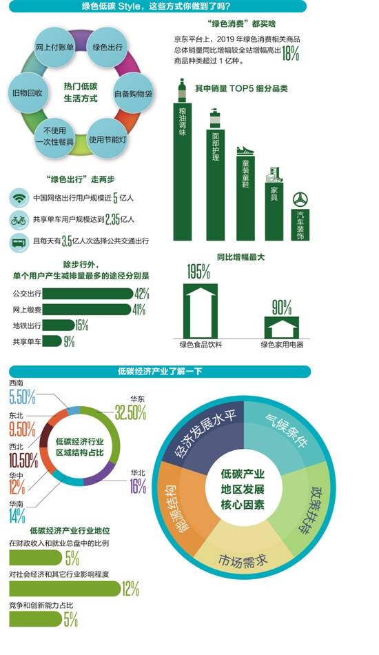 除了绿色出行和绿色消费的增长,公众在低碳意识方面也有了一定程度的提高。调查发现,公众对于“低碳”这个名词的熟悉度和认同度很高,大部分受访者认为低碳生活与高品质生活相关联。其中41%的受访者认为低碳可以“减少浪费”。33%的人认为低碳有助于“可持续发展”,32%认为它可以“减少空气污染”。同时,也有33%的受访者提到低碳使自己的生活更健康。另外,调查也显示出公众对于低碳生活存有学习和思考空间,例如31%的受访者希望学习在生活中如何更好地辨识低碳产品,另有28%、24%的受访者分别希望了解产品的碳足迹如何计算以及低碳环保是否会增加生活成本。 互联网提高公众践行绿色低碳行为积极性的同时,不可避免地也带来了新的环境污染问题。从互联网的便利性购买渠道来看,公众大范围消费和出行行为导致了一部分的资源浪费,例如共享单车大面积堆积、外卖包装污染、快递纸箱浪费和旧物回收时垃圾未分类等现象。 低碳产业发展的驱动层因素主要为经济发展水平 ,这也导致中国低碳经济行业区域结构分布不均匀。报告显示,低碳经济行业结构中,拥有长三角经济圈的华东市场占比最多,竞争尤为激烈;华北、华南分居二、三位,京津、广深等龙头城市带动周边低碳经济市场;华中以12%的市场占比位居第四,武汉、长沙等城市低碳经济需求较大;西北、东北经济下滑,低碳经济相对较为保守;西南经济欠发达,低碳经济需求较少。 对于互联网平台背景下公众绿色减碳遇到的难题与困境,生态环境部环境与经济政策研究中心课题组专家建议:一是完善政策制度,保障互联网市场正常运行,给公众提供良好的绿色低碳参与平台和环境。一方面对互联网企业和商家的绿色低碳产品给予鼓励激励;另一方面,还要对低碳出行、绿色消费、旧物回收、绿色租赁等领域的互联网企业加强管理,减少因恶性竞争和规划不善导致的资源浪费情况。二是整合互联网大数据,组织相关机构专家,对互联网平台产生的绿色低碳行为领域进行全面系统深入分析,总结经验和问题,为互联网相关领域规范管理提供技术支持,促进各个行为领域的良性循环。 ■数据来源:《家庭低碳生活与低碳消费行为研究报告》;《2020低碳经济行业分析调研报告》; 生态环境部《互联网平台背景下公众低碳生活方式研究报告》;京东《2019绿色消费趋势发展报告》;皮书数据库 ■绿色低碳出行,走两步!