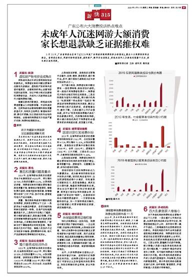 3月10日,广东省消委会发布了《2019年度广东消委系统消费投诉分析报告》,提出六大消费投诉热点难点。省消委会指出,网游纠纷热度较高,虚拟财产、账号安全成焦点,多起未成年人为游戏充值数千元后,家长
