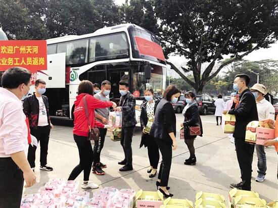 ■广州市天河区人社局为返岗人员发放健康礼包。 |