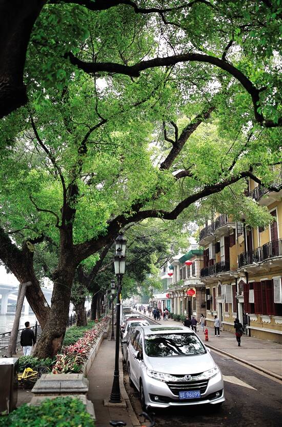 ■在广州市沙面岛,一些车辆停在路边停车位中。4月起,广州市中心六区城市道路临时泊位使用费将调整。 新快报记者 龚吉林/摄 |