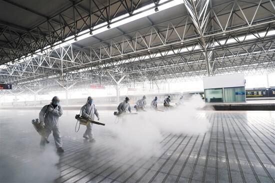 ■3月24日,50名消防员对湖北宜昌东站广场、候车室、月台等各个角落进行全面消杀,为恢复运营做准备。 新华社发