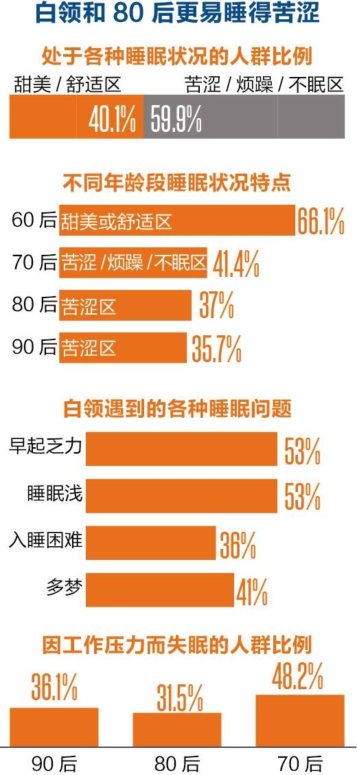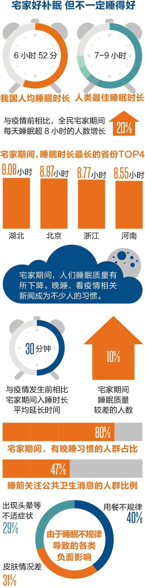 为了“拯救”睡眠,各类助睡方法、物件近年来轮番登场。除了使用精油、止鼾器外,智能助眠小夜灯、智能手环、智能睡眠眼镜等“黑科技”产品也广受消费者喜爱。有数据显示,助眠商品的市场空间还在不断扩大。 ■策划:新快报记者 罗韵 ■统筹:新快报记者 梁彧 ■采写:新快报记者 郑栩彤 ■制图:廖木兴 宅在家更晚睡,睡眠质量差人群上涨12% 蜗牛睡眠数据显示,我国人均睡眠时间为6小时52分,离人类最佳睡眠时长7-9小时尚有距离。其中,约三成的人睡眠时长在6小时以下。睡眠时长不足是许多人面临的一大睡眠问题。由于睡不好导致的后果包括没精神、工作效率低、记忆力差、掉发等。那么,是否只要睡得够,便能保证睡眠质量好? 疫情期间,连续的宅家生活为人们带来了补觉的好机会。慕思寝具和中国睡眠研究会调研的数据显示,与疫情暴发前相比,全民宅家期间每日睡眠时长超过8小时的人数增长了20%,在卧室活动时长超过12小时的人数增长了19%。其中,湖北地区人们的平均睡眠时长达到9.08小时,居全国之最。北京、浙江、广东等十余个省份的平均睡眠时长都超过8小时。然而,入睡难的问题却困扰着宅在家的人们。 与疫情暴发前相比,宅家期间睡眠质量差的人数上升了12%,入睡时长平均延长了30分钟。数据显示,习惯性晚睡或是导致睡眠质量差的罪魁祸首。宅家期间,80%的人有晚睡习惯。睡前,近半数人群会用手机观看公共卫生消息。睡不着时,约六成人群又会选择继续玩手机。后果是——睡眠不规律为人们带来了“惨痛”的教训。宅家期间,出现皮肤变差、头晕不适情况的人群均在三成左右,仅两成左右的人群认为身体机能和精神状态更好了。 对此,中国睡眠研究会常务理事张斌建议,宅家期间也应制定作息时间表并保持规律睡眠节律,不要早上睡醒直接吃午餐,成年人睡眠时间应保持在7小时左右,并尽量在寝具、光线、温度方面营造舒适的睡眠环境。 80后90后睡眠问题最多 00后也识失眠滋味 不同群体面临着不一样的睡眠问题。猎豹数据显示,总体而言,全国睡眠状况处于甜美或舒适区的人群占比约四成,其余六成处于苦涩、烦躁或不眠区。分年龄段看,50后睡眠时长在各代际中最短,但睡眠质量却最高。超四成的50后可以每天睡到自然醒。即便老年人容易因身体机能原因失眠,但仍有约七成的60后睡眠状况处于甜美或舒适区。相比之下,70后更容易处于苦涩、烦躁或不眠区。80后和90后则更易处于睡眠苦涩区。 总体而言,2000年前出生的人们,年纪越大,睡眠指数就越高,即睡眠质量越高。为职业奋斗的众多年轻人则不得不承受睡眠之“痛”。其中,处于职业关键期的80后是失眠的主要人群,超三成的90后和80后因工作压力失眠。CBNData数据则显示,四成职场人士在夜晚加班并于0点后入睡。白领群体则普遍面临早起乏力、睡眠浅、入睡困难和多梦的睡眠问题。而由于长时间低头工作、睡眠状况不佳,脊椎疾病也呈现出年轻化趋势。目前,颈椎病发病高峰期已提前到39岁。 值得一提的是,随着学习压力增大,00后也面临较显著的睡眠问题。喜临门数据显示,00后的睡眠指数在各代际中仅高于80后和90后。大部分处于初高中冲刺学习阶段的00后,每周平均失眠次数达到1.8次。需要在学习或生活上帮助孩子的多数家长们,其睡眠状况也受其影响。数据显示,05后入睡时间为21时36分,而家长往往要在孩子入睡后2个小时才能入睡。