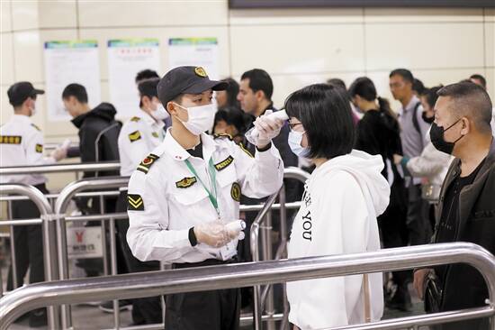 ■广州火车站,地铁安检员对进站的旅客进行体温检测。 新快报记者 毕志毅/摄 |